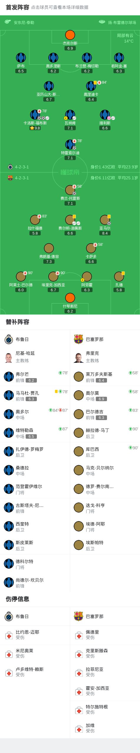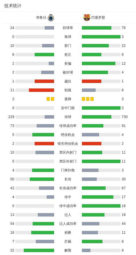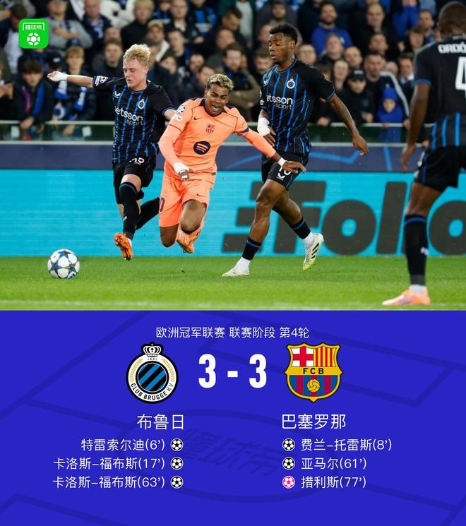 北京时间11月6日欧洲冠军联赛 联赛阶段 第4轮,布鲁日对阵巴塞罗那。上半场,福布斯助攻,特雷索尔迪破门。费尔明传球,费兰光速扳平比分。主队快速反击,措利斯助攻,福布斯建功。下半场,费尔明脚后跟助攻,亚马尔扳平比分。瓦纳肯直塞,福布斯单刀再次帮助主队反超比分。亚马尔似传似射,措利斯不慎自摆乌龙。补时阶段,弗尔芒铲抢什琴斯尼后破门,不过主裁判泰勒观看VAR后取消了进球判罚。全场比赛结束,巴萨客场3-3战平布鲁日。