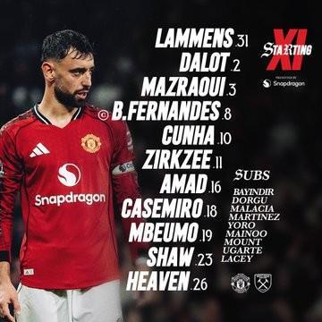曼联vs西汉姆联:布鲁诺-费尔南德斯、卡塞米罗首发,万-比萨卡、鲍恩出战
