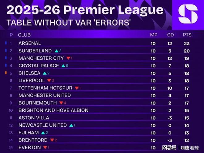 有趣的是,著名数据分析网站Squawka,统计了关于去除VAR争议判罚的积分榜,阿森纳仍高居第一,桑德兰则上升到第二名,曼联是为数不多名次没有改变的球队,是不是意味着,桑德兰遭遇了更多不利判罚。