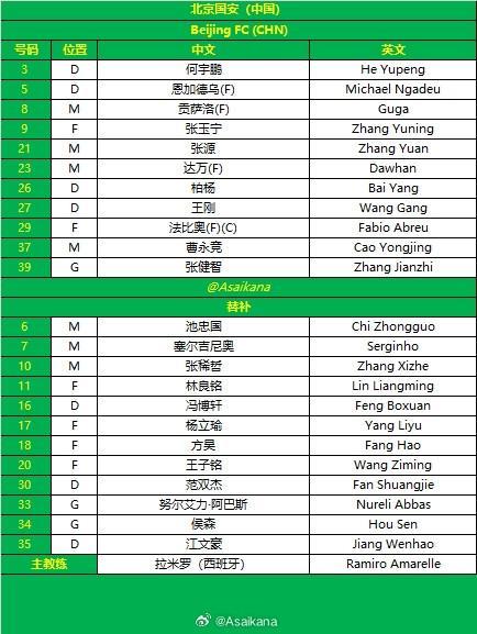 北京国安首发:3-何宇鹏、5-恩加德乌、8-古加、9-张玉宁、21-张源、23-达万、26-柏杨、27-王刚、29-法比奥、37-曹永竞、39-张健智